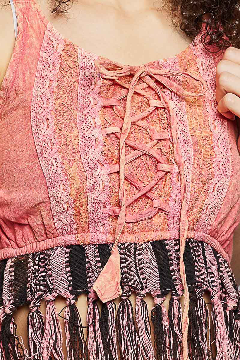 A delicate bra-top–style piece featuring handmade playful fringe at the hem, accented with lace and trim details. Finished with a front tie closure for an adjustable fit, this piece offers a charming, feminine look with a soft, natural feel.