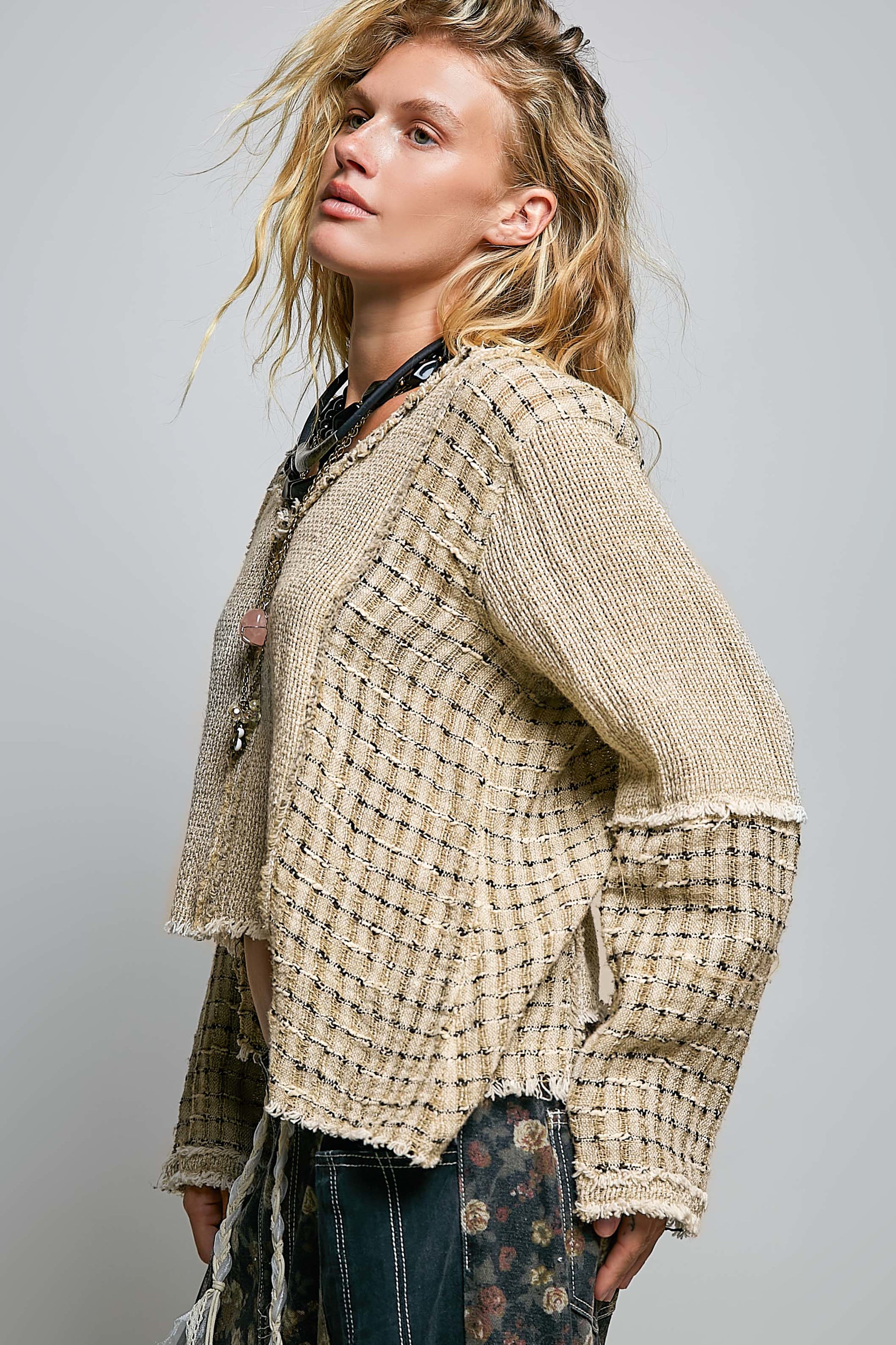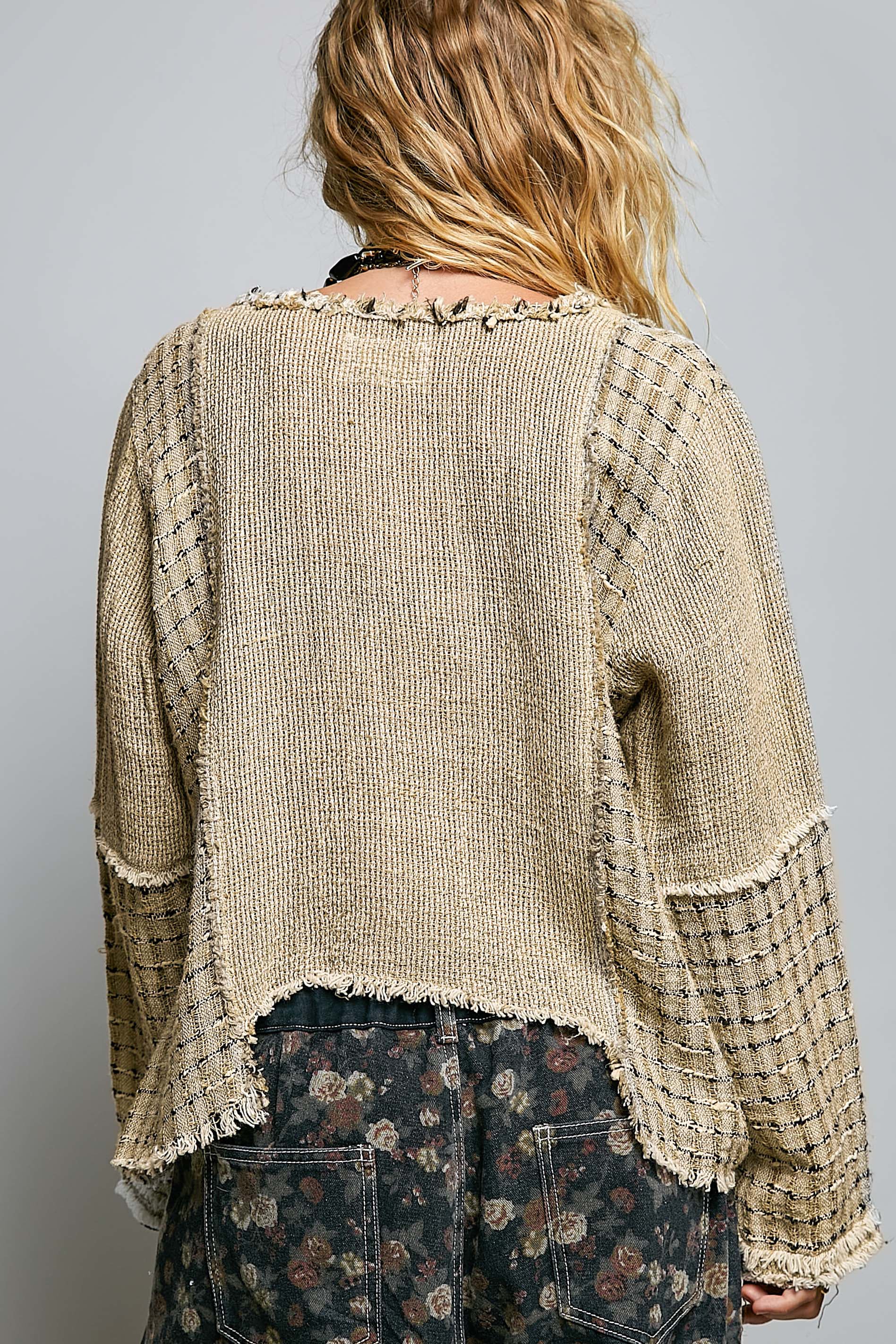 V-neck, long-sleeve, relaxed-fit top crafted from breathable linen, featuring contrasting textures with loosely knitted construction. With outseam and raw-edge detailing and a high-low hem, this piece combines effortless comfort with refined texture for everyday styling.