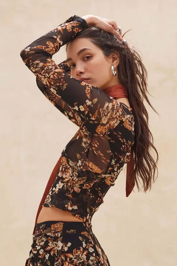 Floral-Print Mesh Raglan-Sleeve Contour Top